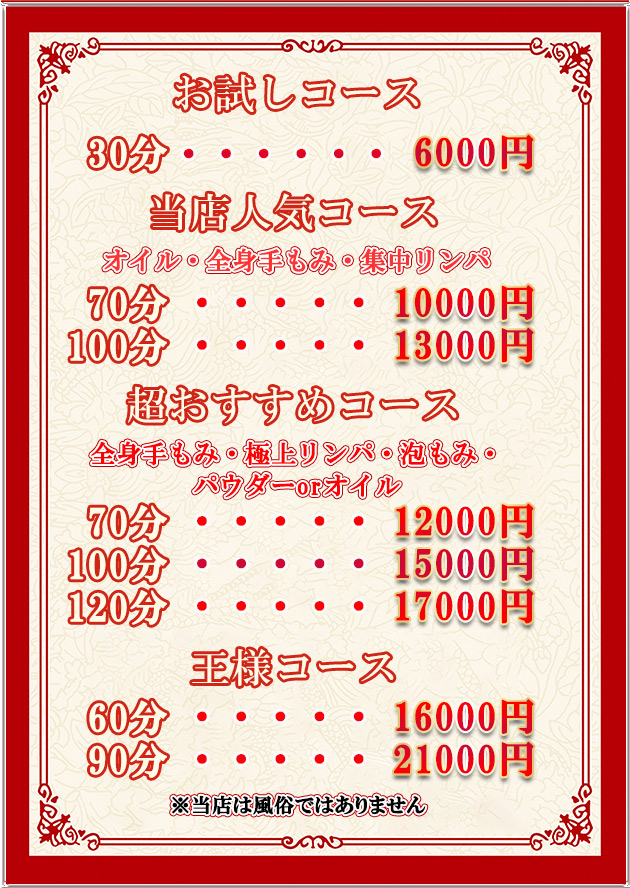 当店では、まずセラピストとの会話を通じてご要望をお伺いし、お客様一人ひとりに合ったサービスをご提案いたします。多彩で豊富なメニューをご用意しており、さまざまなお客様のニーズにお応えできるのも魅力です。完全個室の空間で、ふたりだけの穏やかな時間をゆっくりとお楽しみください。施術中はもちろん、ご帰宅後やお休みの際、翌朝の目覚めまで続く自然で優美な香りに包まれ、心身ともに深く癒されるひとときをご堪能いただけます。