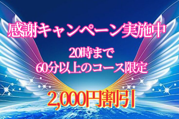- 感謝キャンペーン実施中 20時まで 60分以上のコース限定 2,000円割引」