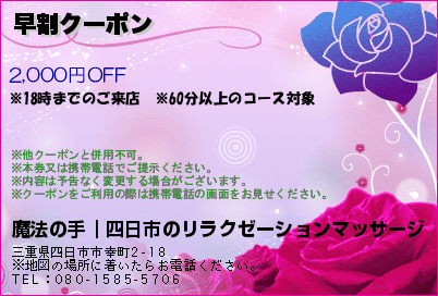四日市駅にある三重 四日市アジアンエステ「魔法の手」の口コミを書いてください。おすすめのコースは30分 / 3,000円~からとなっています営業時間は12:00~LAST ですので080-1585-5706へお気軽にお問い合わせください。