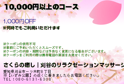 刈谷市 一ツ木駅徒歩8分にある刈谷市アジアンエステ「さくらの癒し」の口コミを書いてください。おすすめのコースは30分 / 3,980円~からとなっています営業時間は24時間営業 ですので080-6131-6308へお気軽にお問い合わせください。