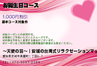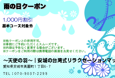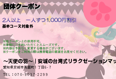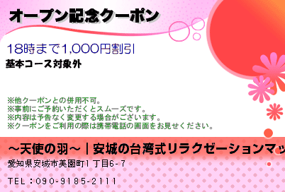 東刈谷駅徒歩約3分にある東刈谷アロマエステ「天使の羽」の口コミを書いてください。おすすめのコースは30分 / 5,000円~からとなっています営業時間は12:00~LAST ですので090-9185-2111へお気軽にお問い合わせください。