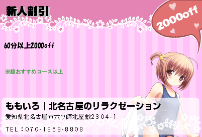 徳重・名古屋芸大駅にある北名古屋市アロマエステ「ももいろ」の口コミを書いてください。おすすめのコースは30分 / 5,000円~からとなっています営業時間は11:00~LAST ですので070-1659-8808へお気軽にお問い合わせください。