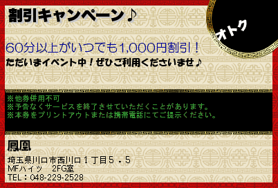 西川口駅西口にある西川口アジアンエステ「鳳凰」の口コミを書いてください。おすすめのコースは40分 / 5,000円~からとなっています営業時間は10:00~翌 04:00 ですので048-229-2528へお気軽にお問い合わせください。