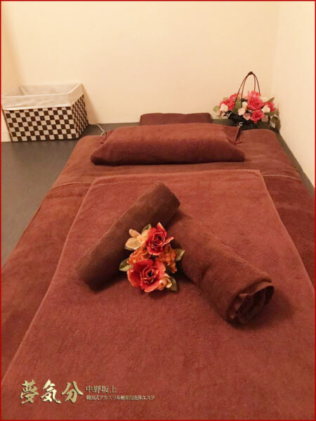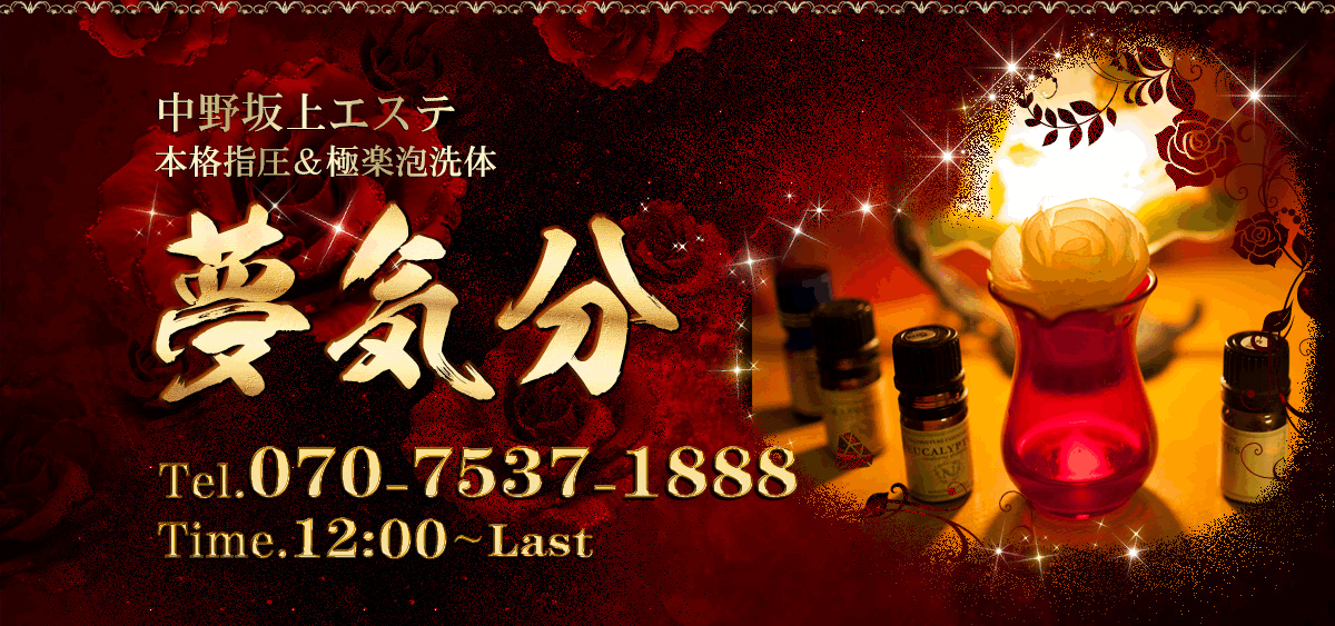 中野坂上駅3番出口徒歩1分のリラクゼーション「夢気分」アロマエステをお探しの方にはオススメです。おススメのオイルリンパマッサージでむくみや冷え性などを緩和する効果があります。アロマオイルコースや基本コースのほか仰向けや特別コースなど豊富なメニューです。