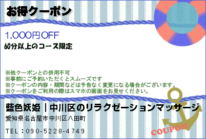 - お得クーポン 1,000円OFF 60分以上のコース限定