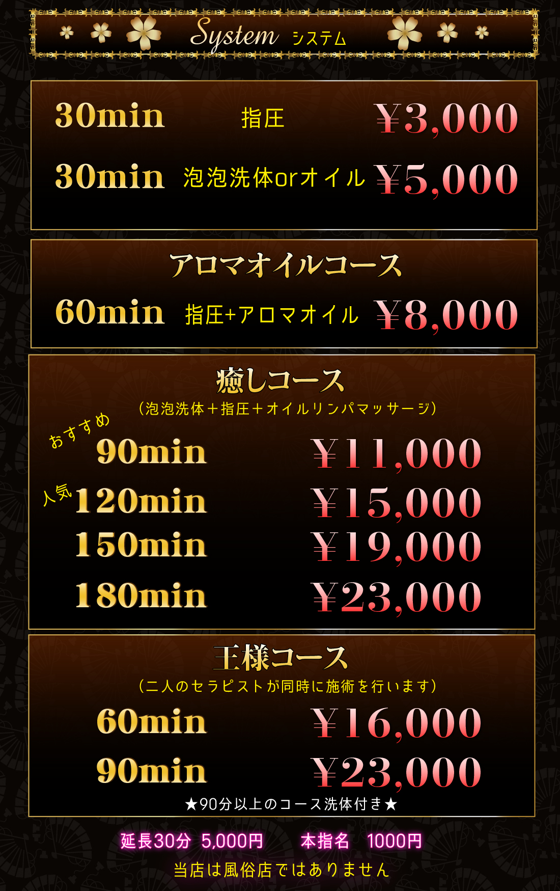 落ち着いた雰囲気の中で行われる丁寧な施術は、身体の疲れを癒すだけでなく、心に溜まった緊張や不安を和らげる効果も期待できます。細やかな心配りと高い技術を兼ね備えたセラピストが、お客様一人ひとりに寄り添いながらひとときをご提供いたします。五感で感じる至福の癒しを、ぜひ当店でご体験ください。
