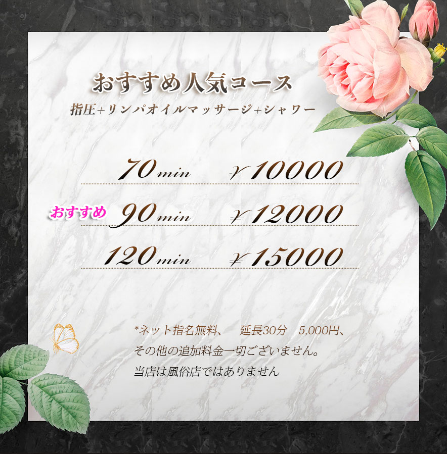 濃厚リンパ、衣装、たっぷりのオイルを使った施術で、プライベート空間で至高の癒しをお届けいたします。鼠径部+10分のサービスもご用意しております。