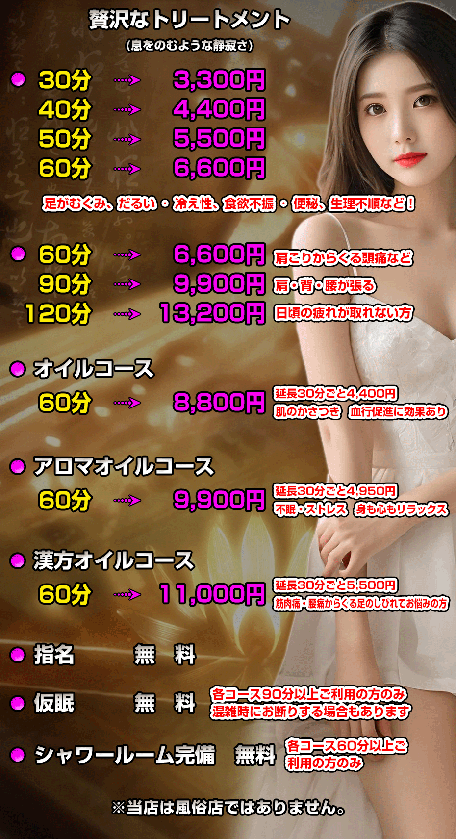 赤坂見附駅徒歩3分にある赤坂アジアンエステ「烏龍 ウーロン」の口コミを書いてください。おすすめのコースは30分 / 3,300円~からとなっています営業時間は12:00~翌 05:00 ですので03-3582-1156へお気軽にお問い合わせください。
