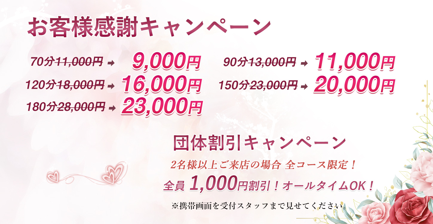 - お客様感謝キャンペーン 70分11,000円→ 9,000円