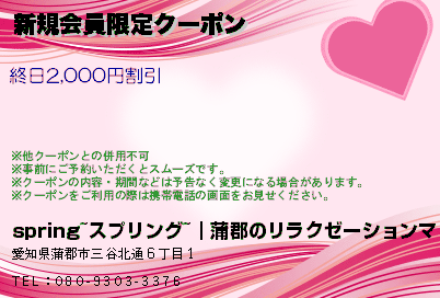 蒲郡駅にある蒲郡メンズエステ「spring(スプリング)」の口コミを書いてください。おすすめのコースは60分 / 10,000円~からとなっています営業時間は12:00~LASTですので080-9303-3376へお気軽にお問い合わせください。