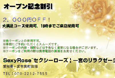 一宮市 開明駅にある一宮市アロマエステ「HealthyRose(ヘルシーローズ)」の口コミを書いてください。おすすめのコースは30分 / 6,000円~からとなっています営業時間は10:30~翌 02:30ですので070-2212-7555へお気軽にお問い合わせください。