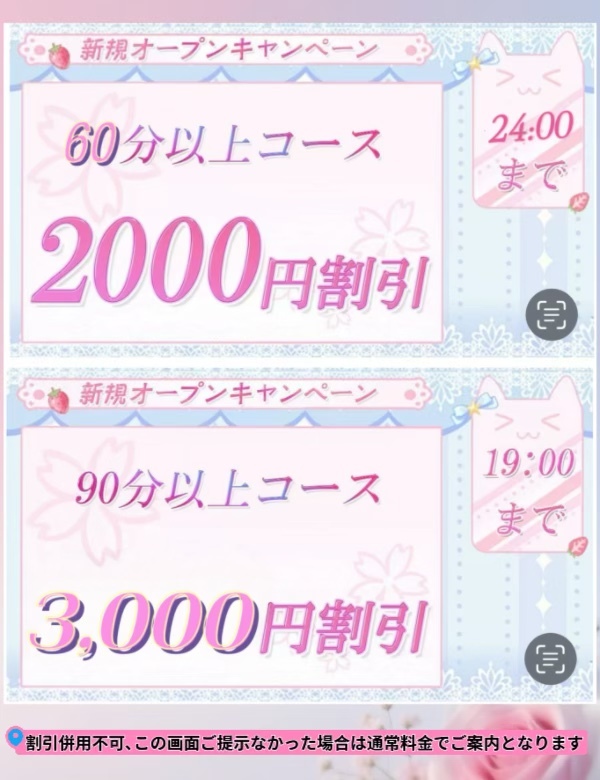 - 新規オープンキャンペーン 60分以上コース 2000円割引