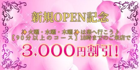新規OPEN記念【90分以上のコース】18時までのご来店は3,000円割引!