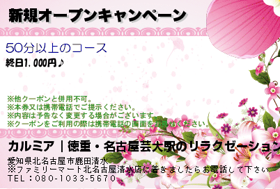 徳重・名古屋芸大駅にある北名古屋市アジアンエステ「カルミア」の口コミを書いてください。おすすめのコースは30分 / 5,000円~からとなっています営業時間は10:00~翌 02:00ですので080-1033-5670へお気軽にお問い合わせください。