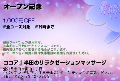青山駅にある半田市アジアンエステ「ココア」の口コミを書いてください。おすすめのコースは60分 / 10,000円~からとなっています営業時間は11:00~翌 03:00ですので080-6972-0253へお気軽にお問い合わせください。
