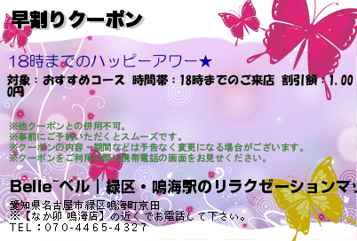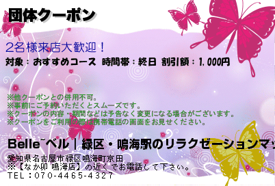 鳴海駅にある鳴海駅アジアンエステ「Belle(ベル)」の口コミを書いてください。おすすめのコースは30分 / 5,000円~からとなっています営業時間は12:00~翌 02:00ですので070-4465-4327へお気軽にお問い合わせください。