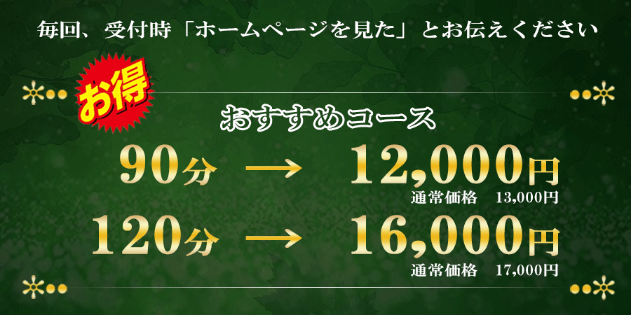 - 毎回、受付時「ホームページを見た」とお伝えください