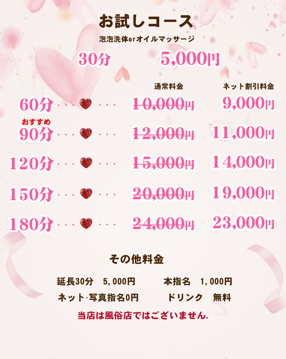 - ネット限定キャンペーン(洗体・指圧・オイル) 18時まで 90分 10,000円