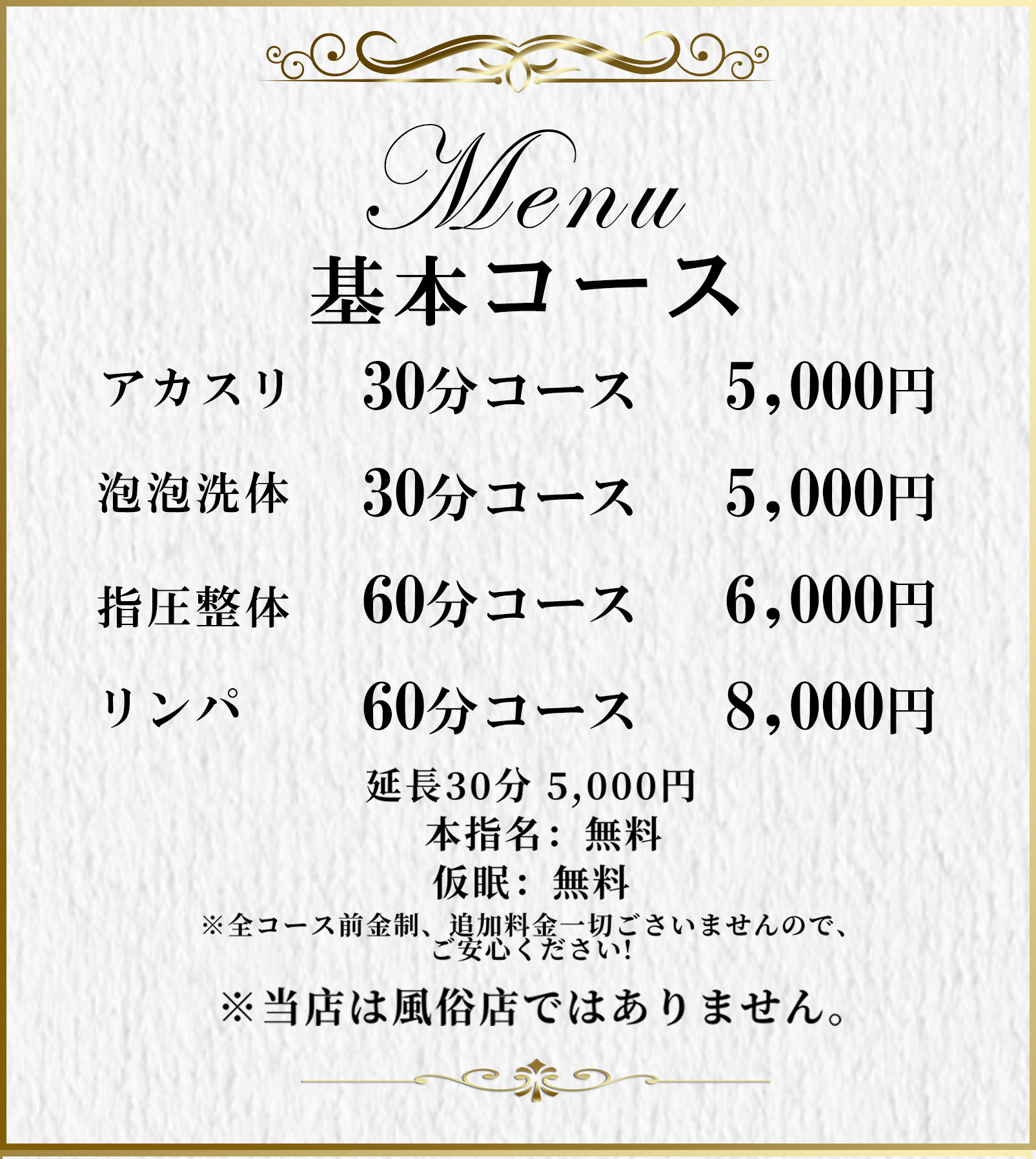 笑顔を絶やさない接客と心地よい会話で、身体の疲れだけでなく心の疲れまでも癒せるような、穏やかな時間をご提供いたします。