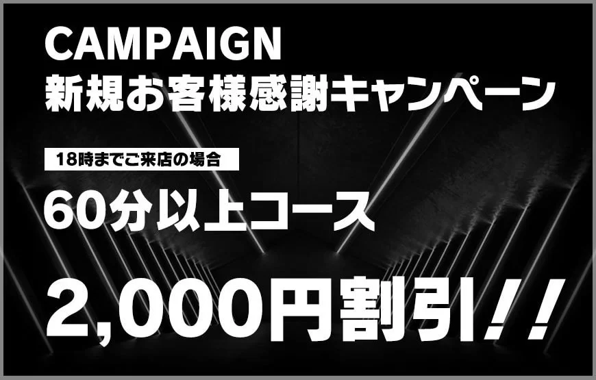 - 新規お客様感謝キャンペーン 18時までご来店の場合 60分以上コース 2,000