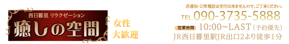 |JR西日暮里駅・JR出口2より徒歩1分の好アクセス。当サロンでは、癒しの空間でお客様に心からリラックスしていただけるよう、ストレス解消と癒しに特化した施術をご提供しております。