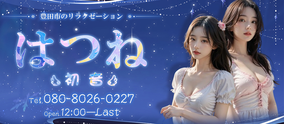 豊田市駅の「はつね(初音)」。20代〜30代の容姿端麗なセラピストが日々のお疲れを癒します。完全個室の空間で、他のお客様を気にせず、セラピストとの特別なひと時をお楽しみください。 最高級のアロマオイルとリンパマッサージで、極上の癒しの空間を提供いたします。厳選された美女たちとリッチな非日常空間で心も体もリフレッシュしてください。