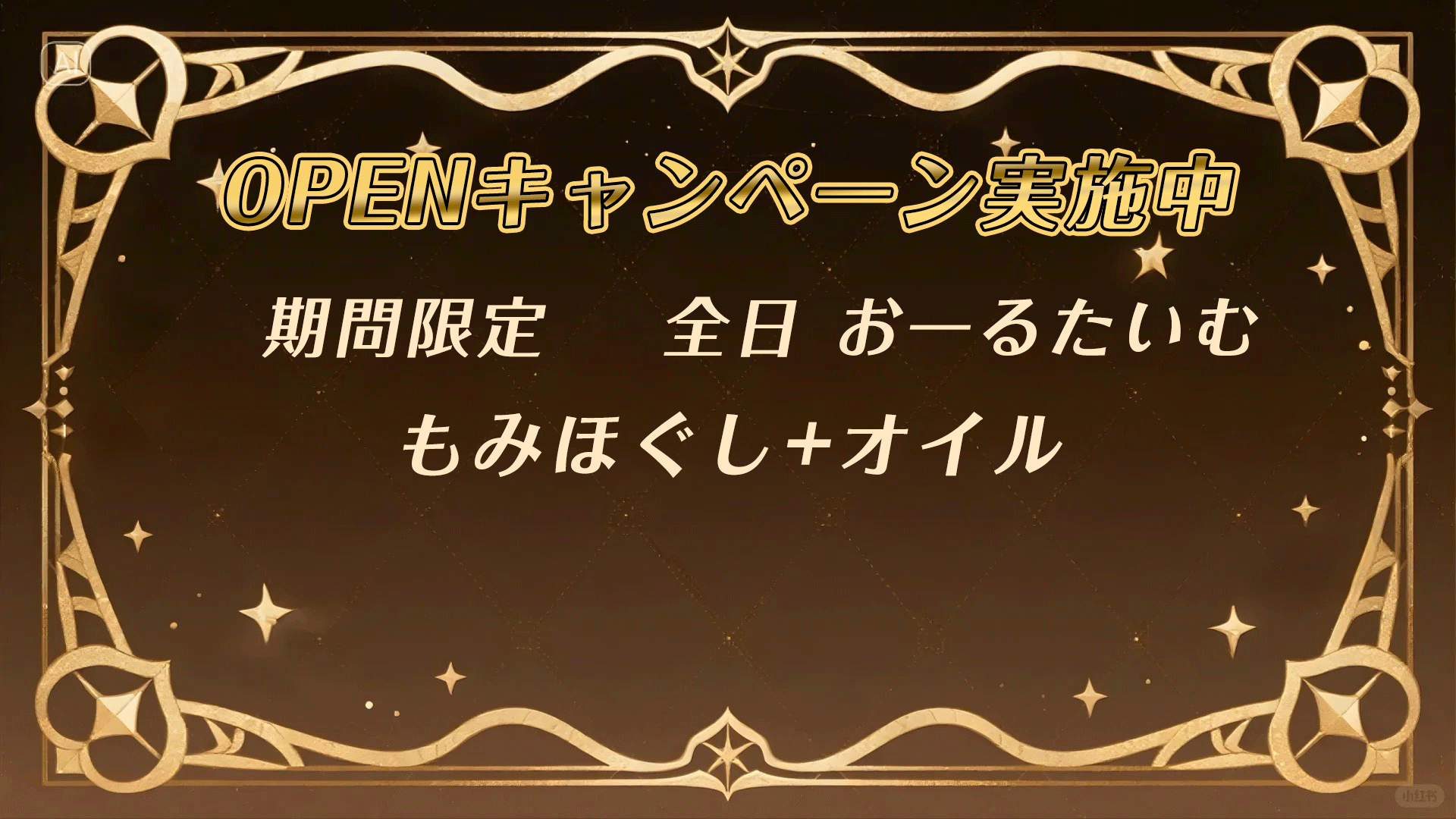 - OPENキャンペーン実施中 期間限定 全日 おーるたいむ もみほぐし+オイル