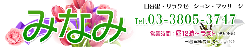 日暮里リラクゼーションマッサージ「みなみ」は、心安らぐアロマの香りと清潔感のある落ち着いた空間で、上質なリラクゼーションをご提供するサロンです。日常生活やお仕事によって蓄積された疲労やストレスに対し、アロマオイルを使用したオールハンドのボディトリートメントで、やさしく全身を整えていきます。丁寧な施術により筋肉の緊張を緩和し、心身ともにリフレッシュしていただけるよう心がけております。穏やかなひとときをお過ごしいただき、健やかな毎日へのサポートとなれば幸いです。皆さまのご来店を心よりお待ちしております。