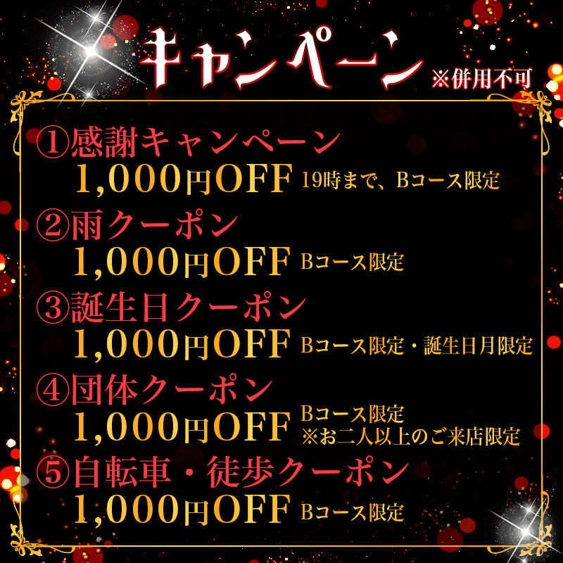 - 感謝キャンペーン 1,000円OFF 19時まで、Bコース