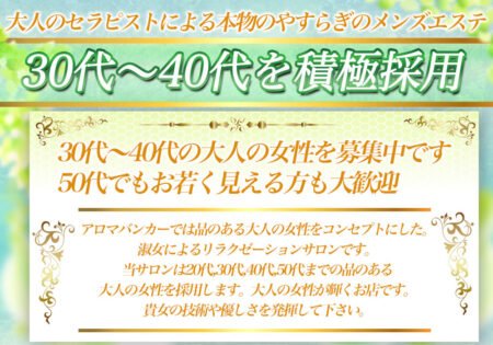 アロマバンカーは年齢でお断りすることはありません。応募年齢 20歳〜50代迄 勤務地 竹ノ塚・西新井